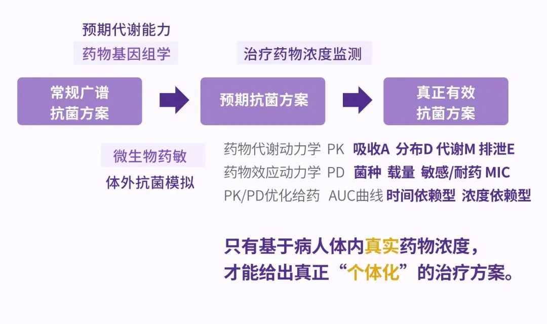 以臨床最常用的抗菌藥物治療為例,精準醫療涉及到多個目前常見的檢驗技術。除常規的肝、腎功能、體重等指標外,藥物基因組學數據可以提供和藥物代謝相關的基因多態性數據,預測機體對藥物的代謝能力;微生物藥敏可以進行體外的抗菌模擬,提供患者所感染的微生物的對不同抗菌藥物的敏感/耐藥情況。但由于藥物的代謝和效應涉及到非常多的因素,預測性的指標顯得非常不足,只有基于病人體內真實的藥物濃度,才能給出真正“個體化”的治療方案。